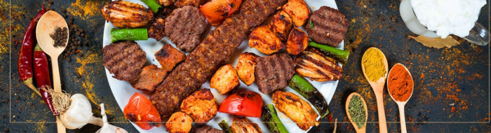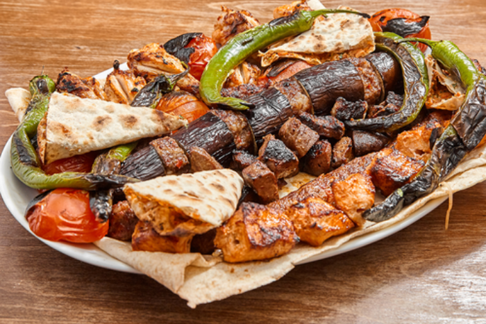 /1/2 Adana kebap, 1/2 domatesli kebap, 1/2 tavuk şiş, 1/2 çöp şiş, fındık lahmacun, fıstık pide, közlenmiş biber, soğan, ezme, bulgur pilavı/